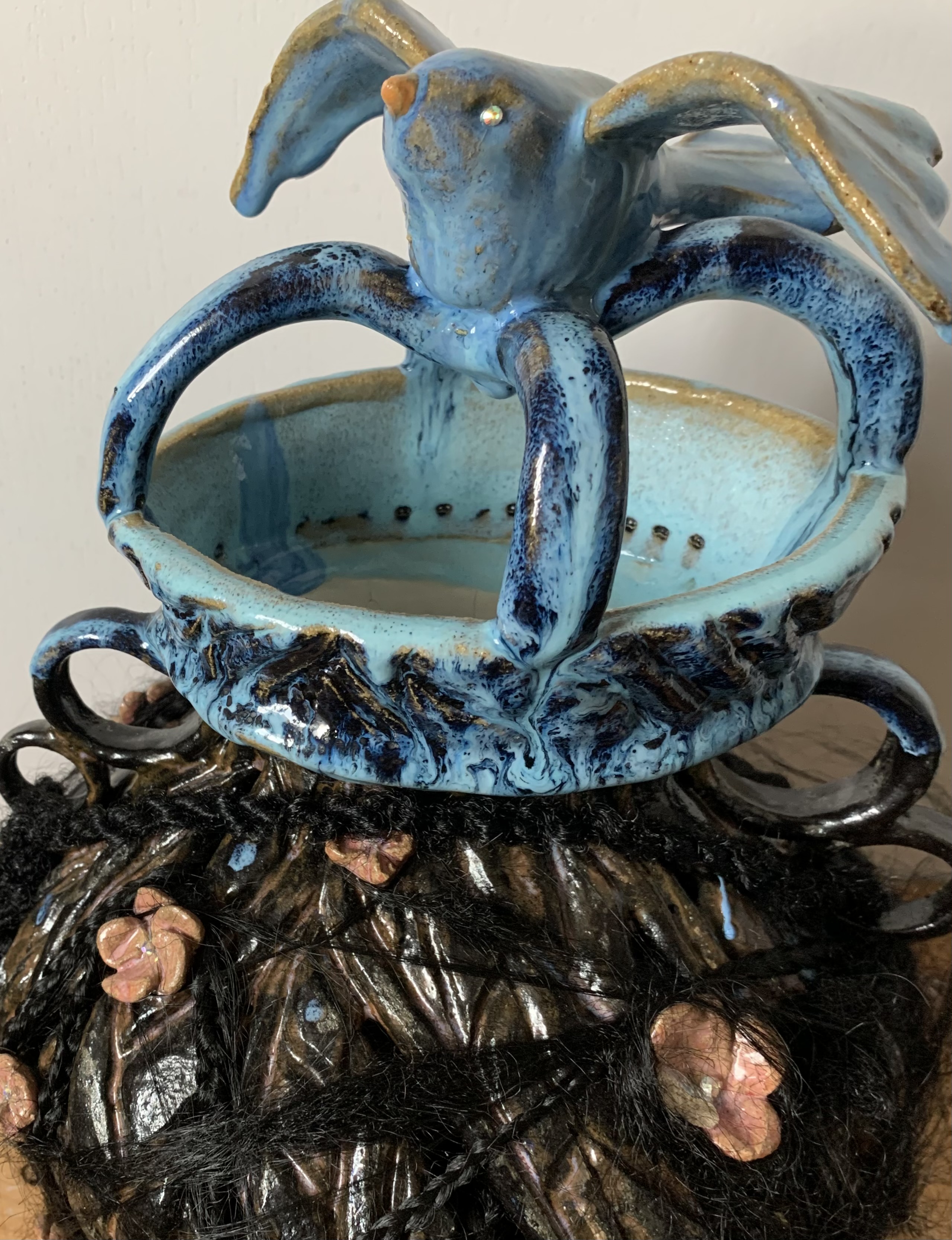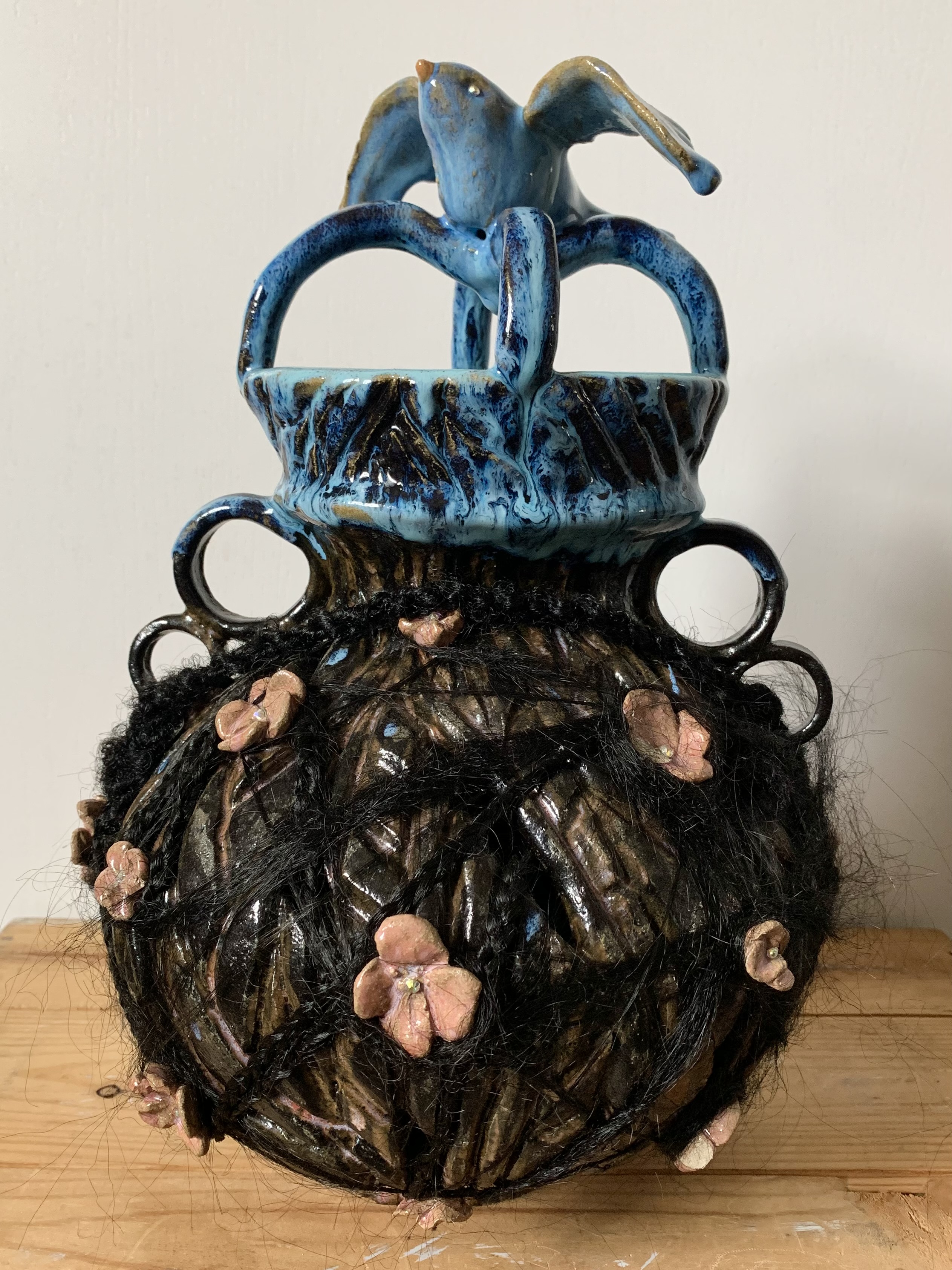2024An orb of entangled ceramic and weave hair, Fairy Knot is an experimental work completed in 2024. Fairy Knot has a moon jar inspired shape; large, round, and intricately hand carved with an interlocking pattern. Glaze drips down like water over the top of the form. Flowers peeking out from the ceramic suggest growth and beauty of entanglement. A blue bird ascends from the top of the form like a baby blue phoenix. This piece is informed by my experience with having black hair. Fairy knots form at the end of curly hair strands and must be cut out or they will tangle more. They are a source of extreme frustration while detangling. A precious name for a persistent frustration.